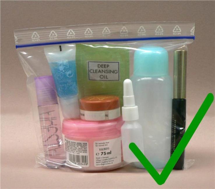 – Tất cả các chất lỏng phải được đặt trong túi nhựa trong suốt. Diện tích túi không vượt quá 20cm x 20cm hoặc 15cm x 25cm.